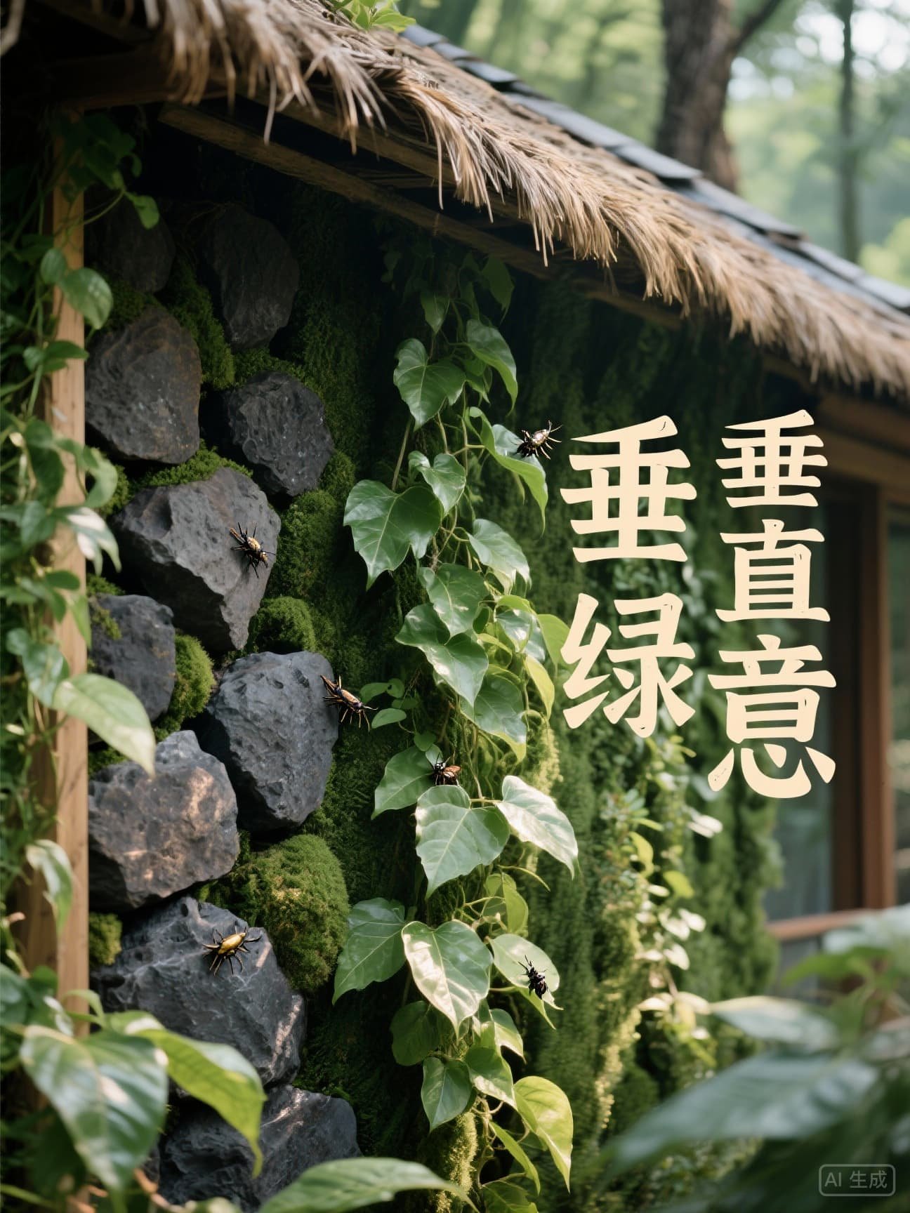 生物友好设计:屋顶茅草层预留鸟类筑巢空间,垂直绿化墙选用本地爬藤植物(五叶地锦、紫藤)