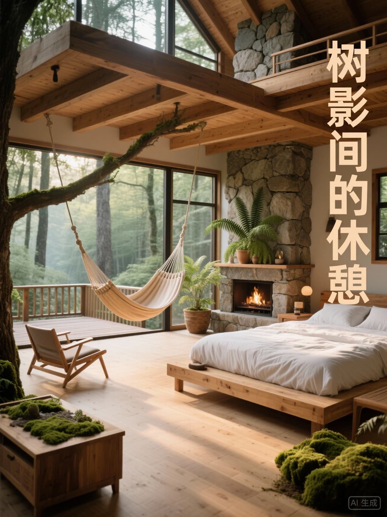 悬挂式睡眠系统:1.8m×2.0m吊床式大床(承重300kg),采用航空级涤纶绳悬挂于实木主梁(松木,直径20cm)
